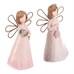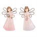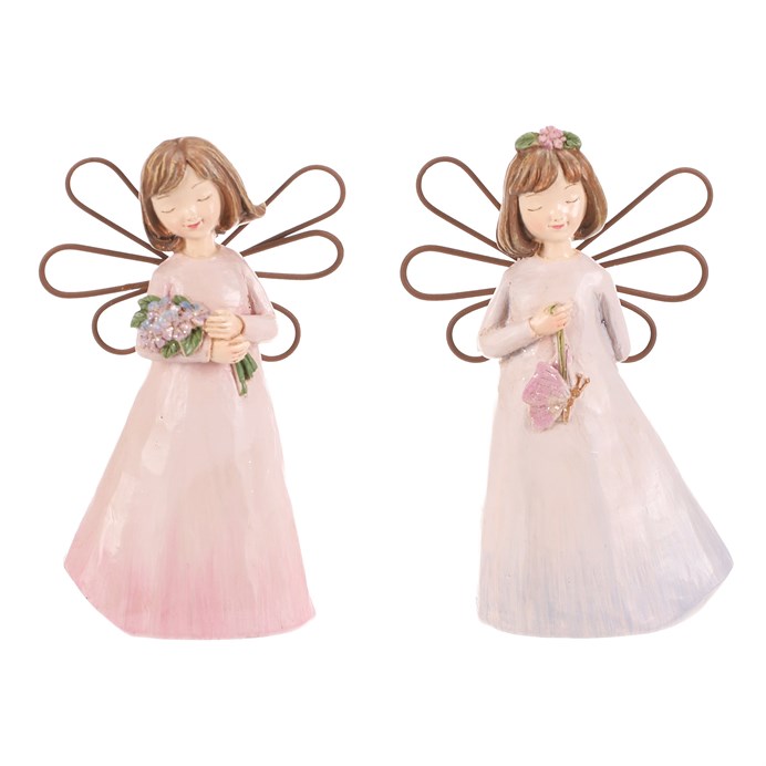 This decorative angel made of polyresin features soft pink shades combined with minimalist metal wings. Designed for standing display, the figurines bring a serene atmosphere with their gentle expressions and detailed floral and butterfly accents. The smooth surface with a subtle gloss highlights the pastel tones of the dresses. Ideal as an accent in interiors with romantic or vintage styles, enhancing coziness and character in the space.