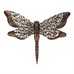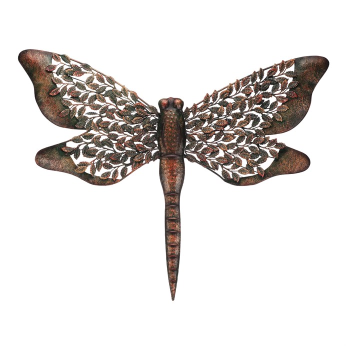 This metal hanging decoration shaped like a dragonfly features intricately detailed wings composed of delicate leaf patterns in a copper finish. The patinated surface gives the piece a rustic character and the visual effect of aged metal. Designed for wall hanging, it adds a natural motif and an interesting accent to both indoor and outdoor spaces. The sturdy metal design ensures durability and easy maintenance.