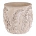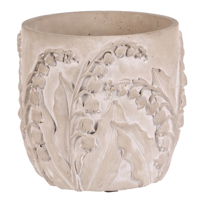 This light gray concrete flower pot features a relief pattern of lily of the valley flowers, adding a natural and rustic touch. Its sturdy concrete body provides stability and durability, suitable for both outdoor and indoor use. The round shape and medium size accommodate various types of plants and flowers. The surface has a finely textured finish that highlights the detailed floral motif. Designed as a practical and decorative accessory for gardens, terraces, and interiors.