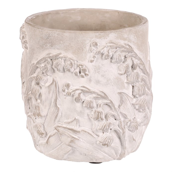 The concrete pot cover in light grey is decorated with a relief pattern of lilies of the valley, which gives a natural and rustic look. Its robust concrete workmanship ensures stability and durability, while the material is easy to maintain. The compact size S is suitable for smaller plants and flowers, ideal for both indoor and outdoor use. The cover will stand out on windowsills, tables or terraces and underline the decorative character of the plants.
