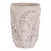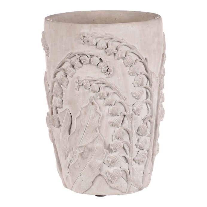 This light grey concrete flower pot features a raised lily of the valley pattern that adds a natural and rustic touch. Its sturdy concrete body ensures stability and long-lasting durability, while the surface finish maintains the raw concrete appearance. The larger size L accommodates bigger plants or floral arrangements, making it both a practical and decorative accessory for indoor and outdoor use. Thanks to its robust design, it is easy to maintain and withstands common environmental influences. Ideal for terraces, balconies, and gardens where its natural texture and detailed floral motif stand out.