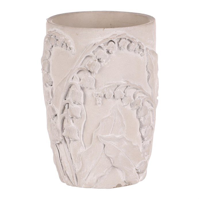 This light gray concrete flower pot features a raised lily of the valley pattern, adding a natural and rustic touch. Its solid concrete body ensures stability and durability, with a surface finish that preserves the raw material character. The medium-sized pot is suitable for various types of plants and easily fits into different interior and exterior settings thanks to its neutral color. Its sturdy design allows safe placement on terraces, balconies, or gardens.