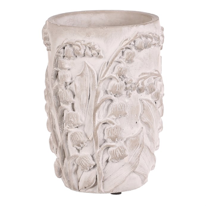 This light gray concrete flower pot features a raised lily of the valley pattern that adds a natural and rustic look. Its sturdy concrete body ensures stability and long-lasting durability, suitable for both outdoor and indoor use. The compact size S allows placement on windowsills, tables, or small shelves. The surface has a finely textured finish that highlights the detailed floral design. Thanks to its robust construction, the pot is suitable for various types of flower containers.