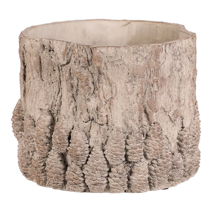 This light gray concrete planter features a surface designed to resemble natural tree bark, enhanced with a relief pattern of pine cones that adds a decorative and natural look. Its sturdy concrete body ensures stability and long-lasting durability, with a material that is easy to maintain. The larger size L accommodates various plants or arrangements that stand out thanks to the textured finish. Suitable for both indoor and outdoor use, it complements rustic or natural interior styles.