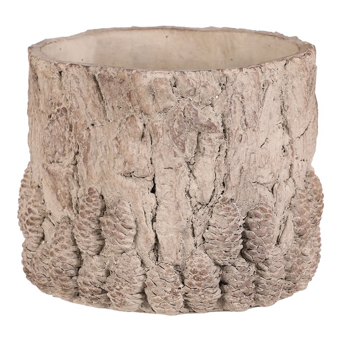 This light gray concrete flower pot features a bark-like surface pattern enhanced with detailed pine cone reliefs, offering a natural and rustic appearance. The sturdy concrete material ensures stability and long-lasting durability. Sized medium, the pot is suitable for placement on terraces, balconies, or indoors, highlighting the decorative character of plants. Its natural texture and intricate relief create an appealing visual contrast with the vibrant greenery of flowers.