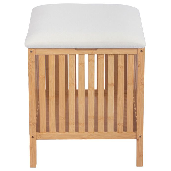 This laundry basket made of solid bamboo in a natural shade combines practical storage space with seating comfort thanks to a padded cushion in a soft white fabric. The bamboo slats form a sturdy and airy base that allows air circulation inside the basket. The padded cushion is covered with an easy-to-maintain fabric, enhancing comfort when seated. Its natural appearance fits well into various interiors, bringing both natural ambiance and functionality.