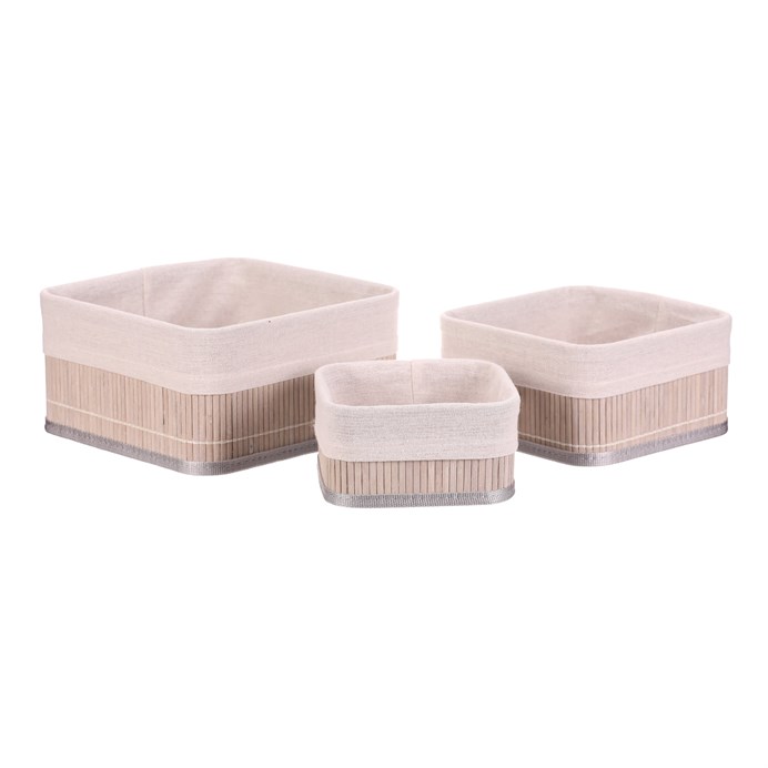A set of three shelf baskets in gray finish combines natural bamboo with textile edging, providing a soft and natural look. The baskets feature a sturdy body made of bamboo slats that ensure stability while remaining lightweight. Suitable for organizing small items on shelves, in cabinets, or on desks. Different basket sizes allow flexible use according to needs. A practical and decorative solution for maintaining order at home or in the office.