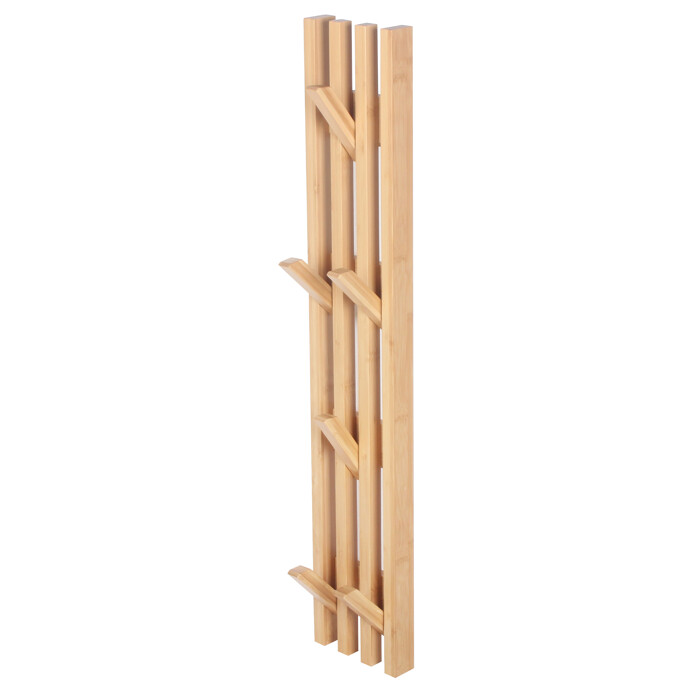 The wall-mounted coat rack made of solid bamboo in a natural shade provides a practical and space-saving solution for hanging clothes or accessories. Its folding design allows easy unfolding and folding as needed, saving space in the interior. The rack consists of four vertical slats with firmly attached hooks arranged on three levels for convenient hanging of various items. The bamboo finish ensures strength and stability, while the material maintains a natural appearance and is resistant to everyday wear. Compact dimensions and a simple mounting system make it suitable for use in hallways, bathrooms, or offices.