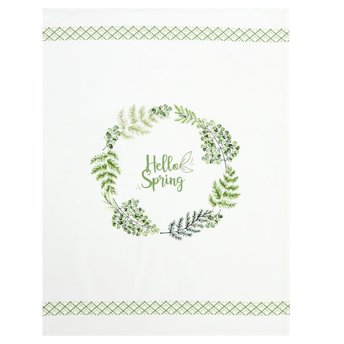 A set of two cotton tea towels featuring a green leaf print brings a fresh and natural touch to the kitchen. Made from quality cotton, the towels are easy to maintain and pleasant to the touch. The delicate wreath pattern is complemented by subtle green stripes along the edges, enhancing the overall design. Their size makes them suitable for everyday household use such as drying dishes or wiping surfaces. The natural shades of green contribute to a harmonious kitchen environment.